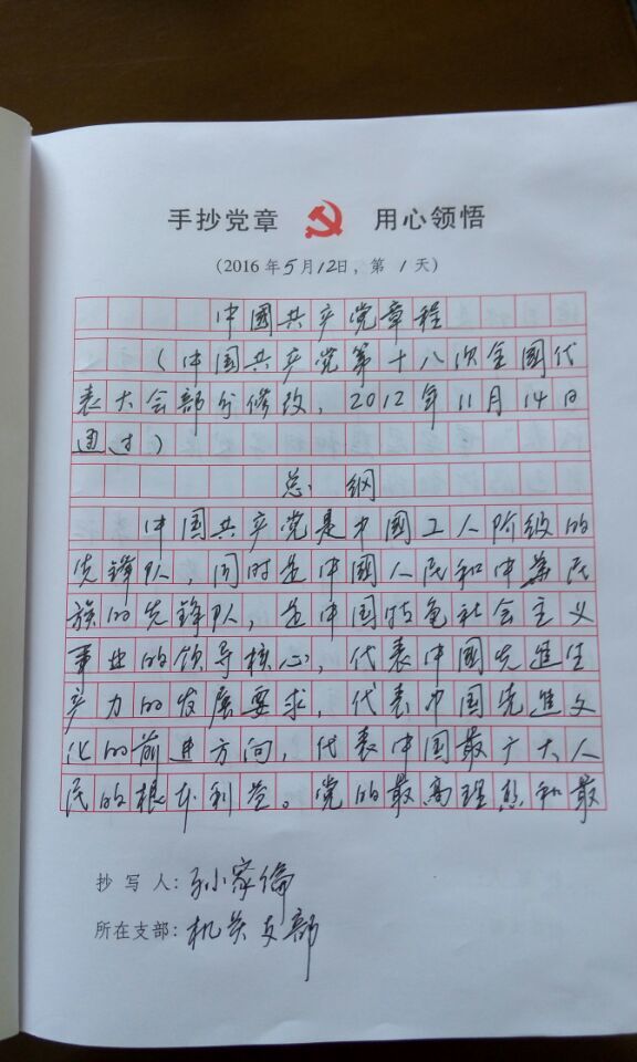 公司黨委統(tǒng)一印制了專門的抄寫本,要求每個在職黨員按每天抄寫150字的速度用100天抄寫完畢。做到每天堅持,在手抄黨章的過程中,逐句逐字研讀黨章,自覺尊崇黨章,遵守黨章,維護黨章,進一步增強黨性觀念,做合格黨員。