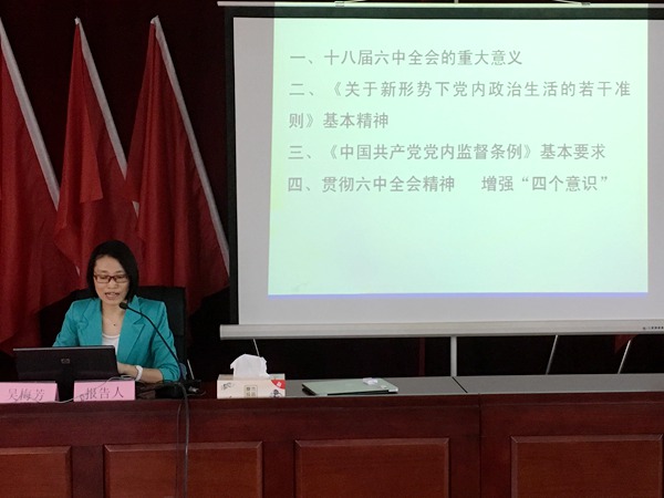 吳梅芳教授從全面從嚴治黨的高度,深刻闡述了黨的十八屆六中全會的重大意義,緊緊圍繞加強和規(guī)范黨內(nèi)政治生活的重要性等四個方面對《關(guān)于新形勢下黨內(nèi)政治生活的若干準則》進行了重點解讀,并就《中國共產(chǎn)黨黨內(nèi)監(jiān)督條例》修訂的內(nèi)容和特點等方面作了提煉分析,對學習貫徹黨的十八屆六中全會精神、不斷強化“四個意識”提出了具體要求。她的報告系統(tǒng)全面,層次分明,站位高、解讀準、接地氣,既有理論深度,又有生動實例,對廣大黨員干部學習領(lǐng)會和掌握黨的十八屆六中全會精神,全面提升企業(yè)黨建工作水平具有重要的指導意義和促進作用。
