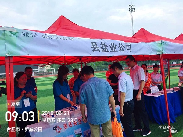按照統一部署6月21日早晨,長豐縣鹽業公司5名工作人員早早就來到了活動現場,帶著《食鹽專營辦法》等宣傳資料、品種鹽樣品及訂制的水杯參加宣傳活動。啟動儀式開始后,首先由縣政協副主席致辭;接著是合肥伊利乳業有限責任公司代表食品生產企業作承諾發言;后由縣人大副主任宣布“長豐縣2019年食品安全宣傳周暨食品安全長豐行活動正式啟動”并會同場上領導共同按下儀式啟動球。活動現場人群涌動,氣氛熱烈,長豐公司5名工作人員穿著統一T恤,佩戴著工作證,分別在兩個展臺開展宣傳。主要宣傳《食鹽專營辦法》、講解多品種鹽知識,推崇“吃好鹽 選中鹽”,吃鹽首選“綠色食品鹽”的健康理念。