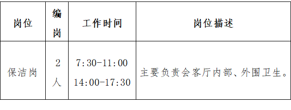 保潔崗:選派的保潔人員必須經過專業技能培訓,身體健康,品行良好,無違法違紀犯罪前科,具有初中以上文化程度,年齡在25至45周歲、身高1.55米以上。保證城市展廳內外部現場的衛生環境。