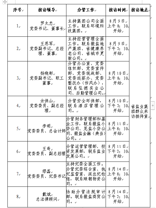 根據(jù)工作安排,現(xiàn)就省鹽業(yè)集團(tuán)領(lǐng)導(dǎo)班子成員8月份接待省鹽業(yè)系統(tǒng)職工群眾來訪安排公示如下: